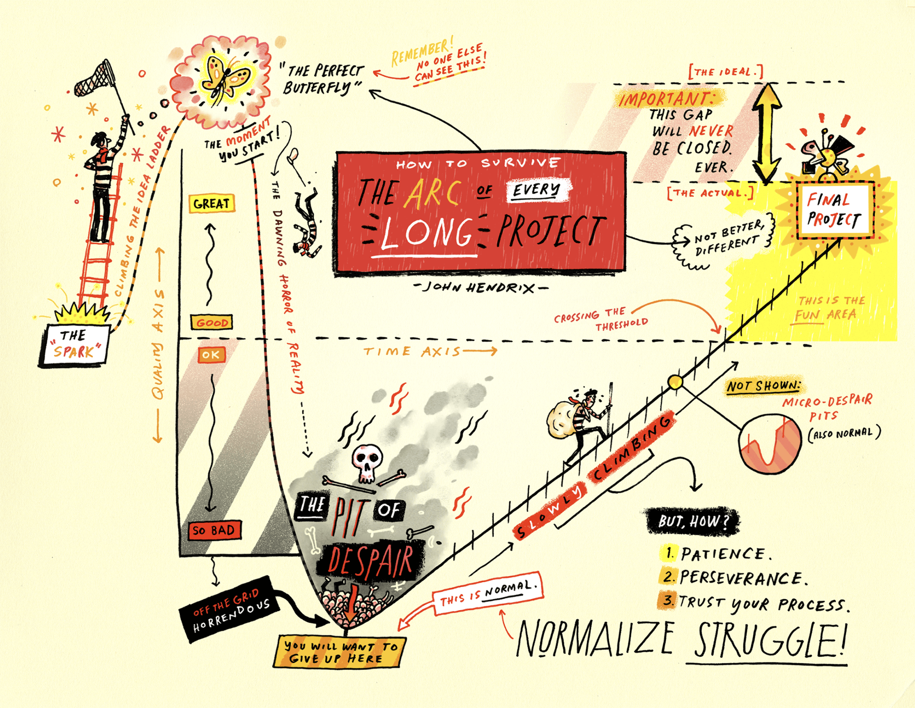 John Hendrix has this diagram about the Pit of Despair - this exact process where you start making your beautiful idea and the result is 'off-the-grid horrendous.' It takes a long, difficult struggle to claw your way back to 'Bad' and then 'OK' and finally arrive at 'Good, but Different.'